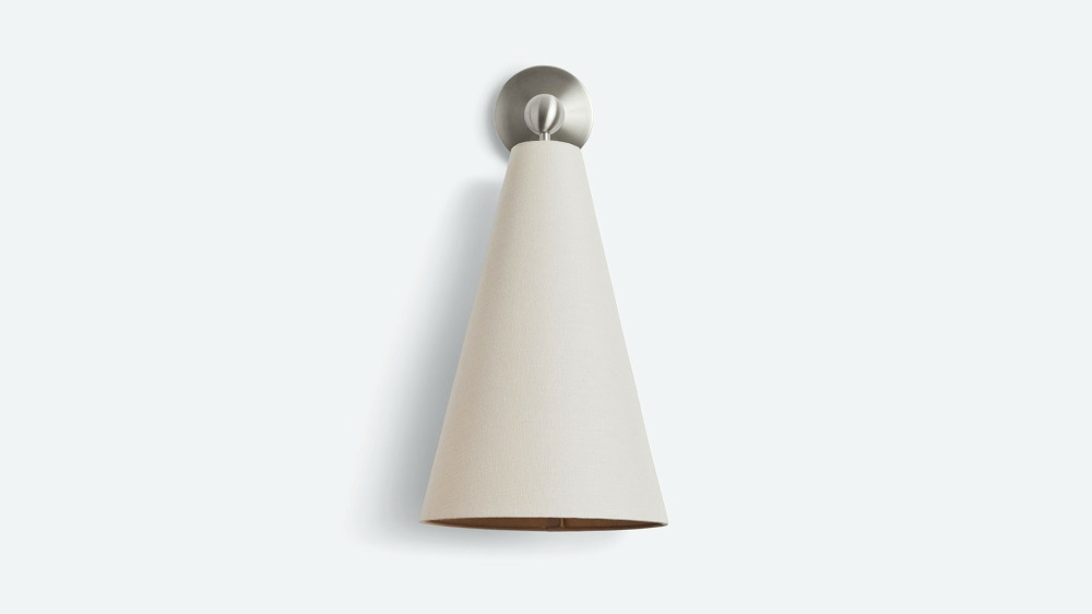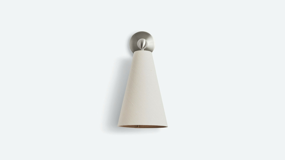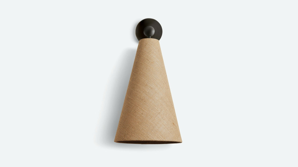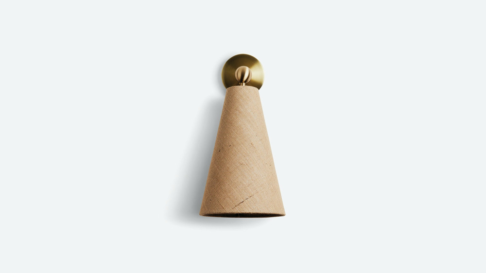 The Pendolo Sconce is composed of a directional fabric cone, radiating a subtle cast of light into a space - and a focused beam of light - in a myriad of configurations. Available in either Natural Burlap or Natural Linen, the cone form is expressed as a singular gesture against a wall.