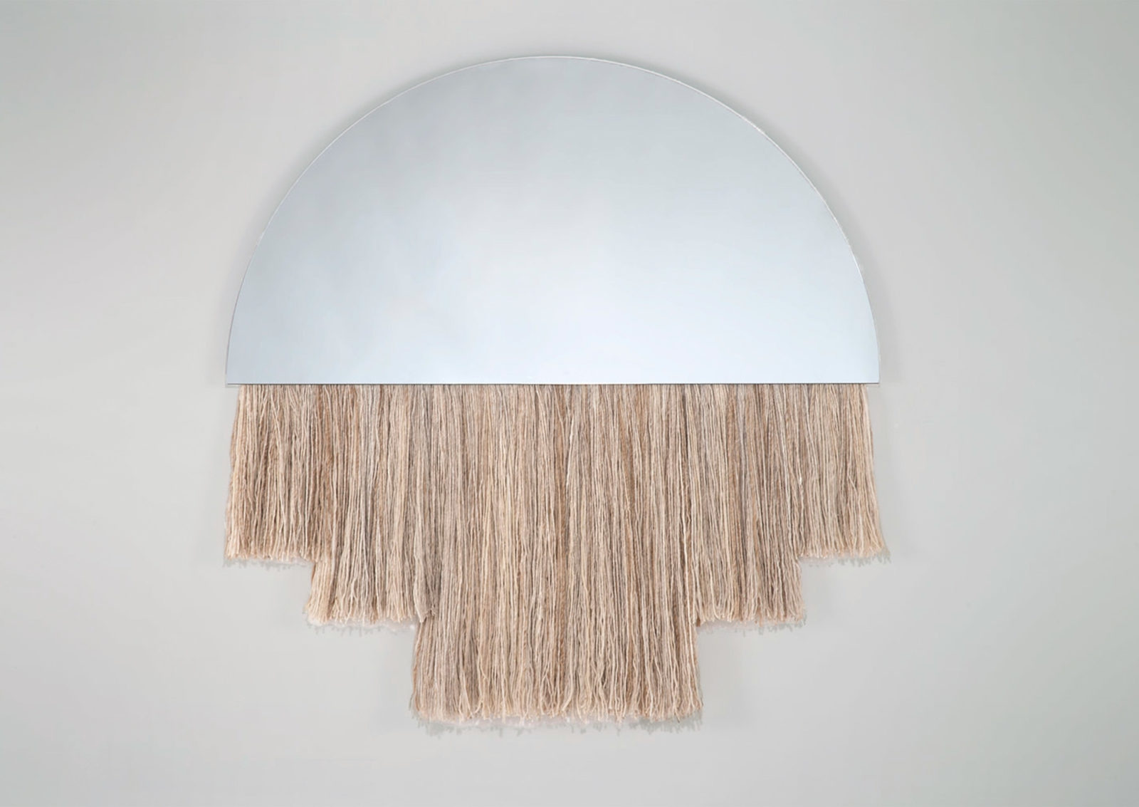 A large-scale mirror reminiscent of a half moon partnered with hand-spun , hand painted silk fibre.