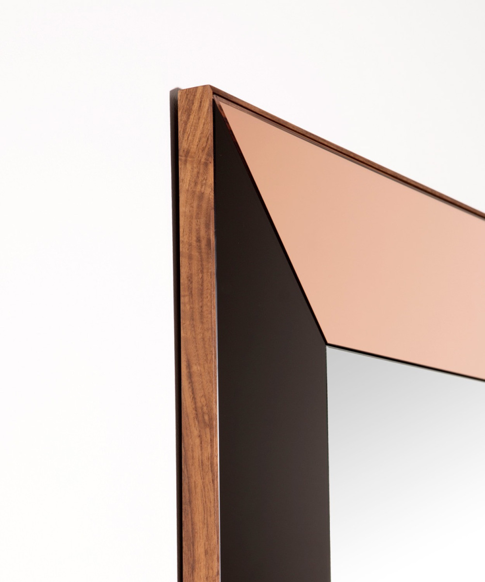 Steam bent walnut or white oak frame. Selection of mirror colours and finishes.