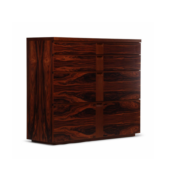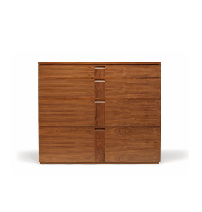Plain jane is a 4-drawer bureau in mixed solids and veneers. It features integral, recessed pulls on full-width graduated maple drawers with cork-lined bottom and heavy-duty runners.