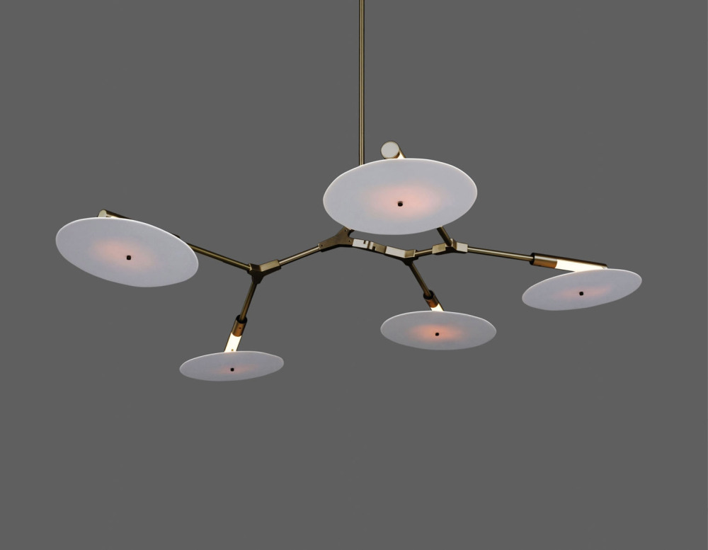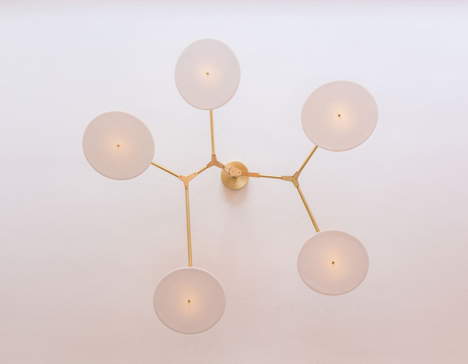 The 5 Globe Branching Disc is designed by Lindsey Adelman. Inspired by natural phenomena, Branching explores the visual tension that results from mixing hand-blown glass with machine-made metal parts. Working closely with an extensive group of local suppliers and master craftspeople has allowed the work to evolve naturally over the the past several years. This refined manufacturing process coupled with an adventurous approach to custom work drives constant innovation.