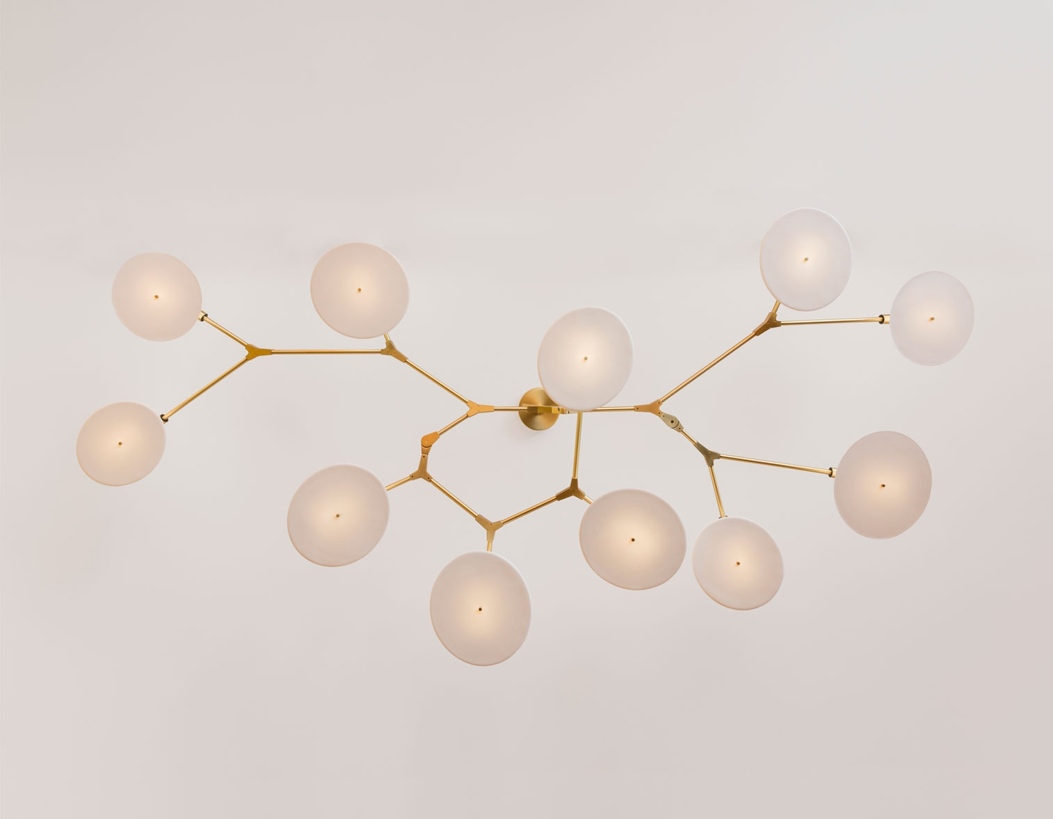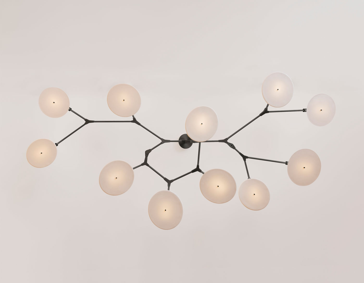 The 11 Branching Disc is designed by Lindsey Adelman. Inspired by natural phenomena, Branching explores the visual tension that results from mixing hand-blown glass with machine-made metal parts.  Working closely with an extensive group of local suppliers and master craftspeople has allowed the work to evolve naturally over the the past several years. This refined manufacturing process coupled with an adventurous approach to custom work drives constant innovation.
