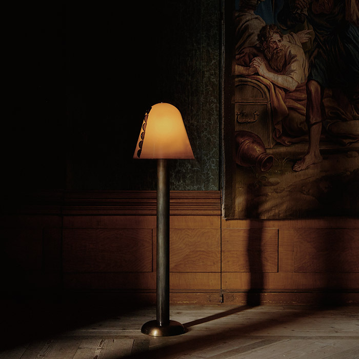 A stand-out floor lamp that doubles as a sculpture. Calla’s shades are made using a modern variation on a centuries-old practice, which involves applying handmade glass details—in this case, rounded fins whose colors deepen when illuminated—to blown glass surfaces.