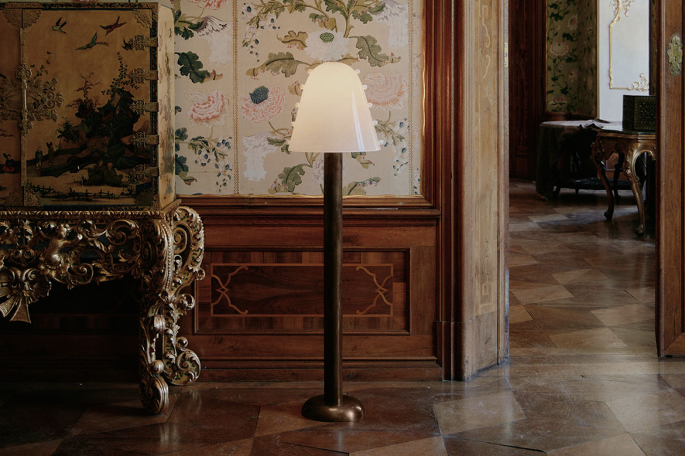 A stand-out floor lamp that doubles as a sculpture. Gemma’s shades are made using a modern variation on a centuries-old practice, which involves applying handmade glass details—in this case, marble-like dots—to blown glass surfaces.
