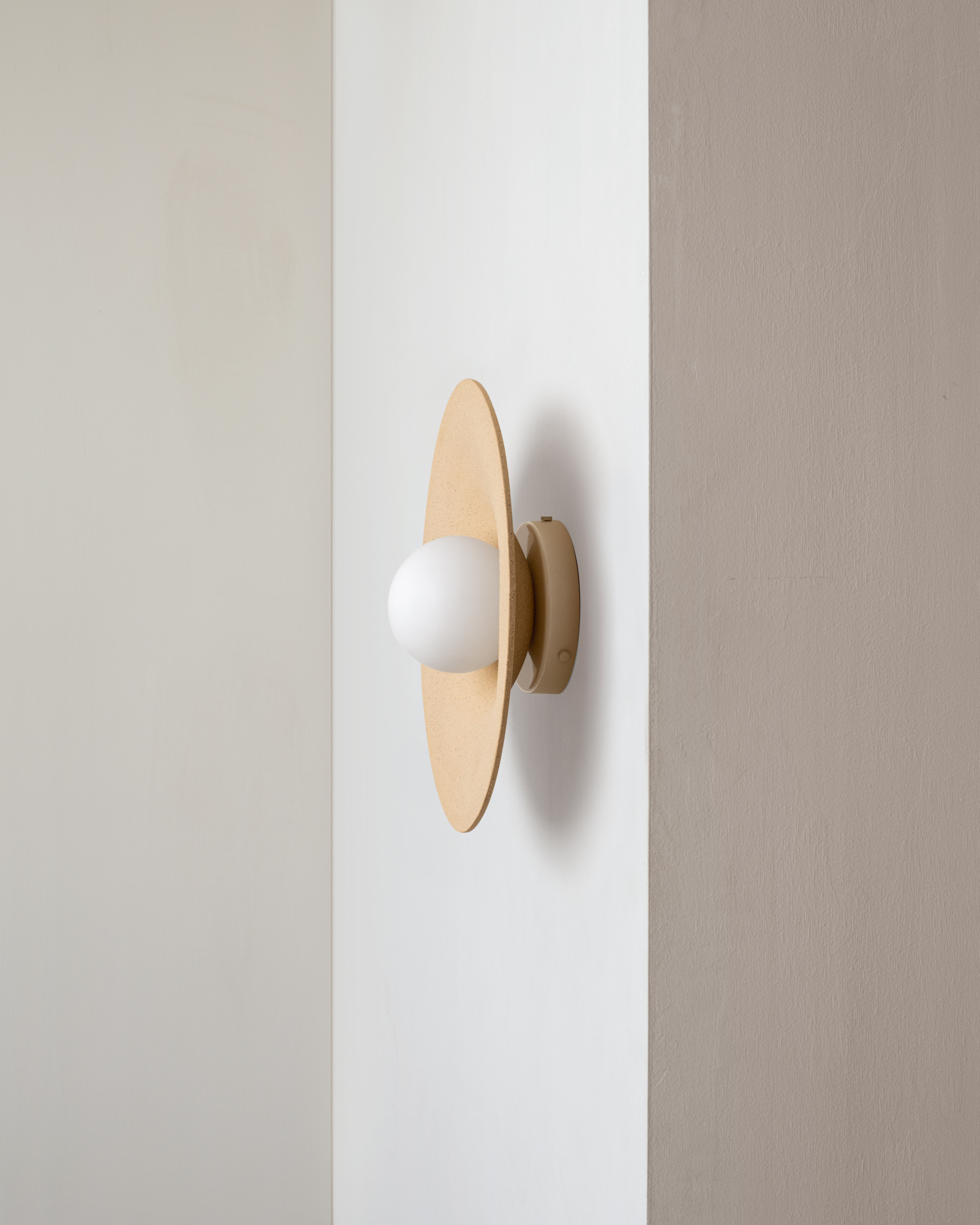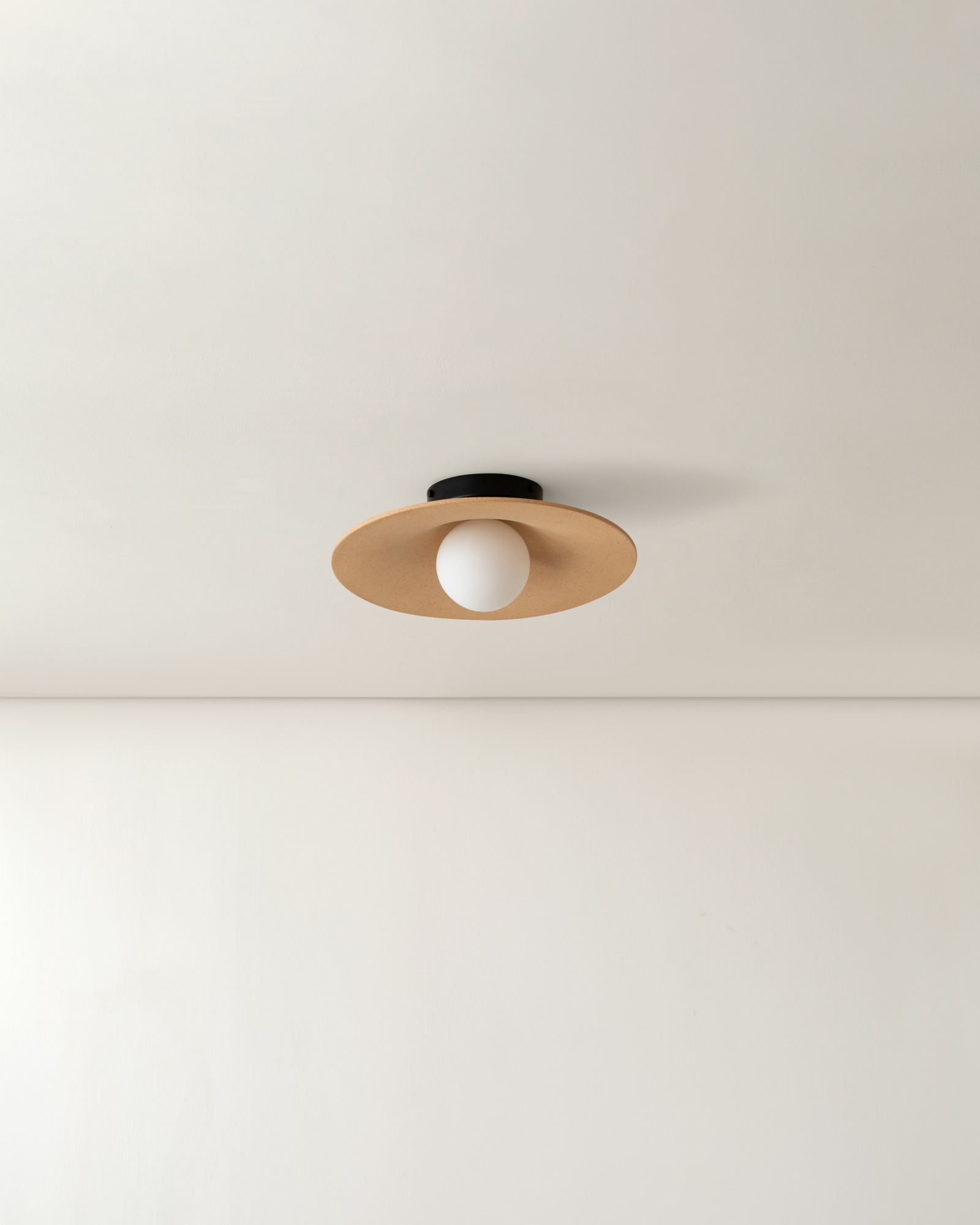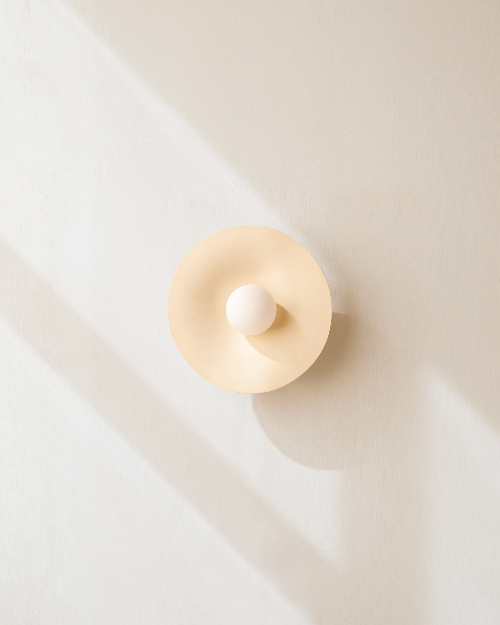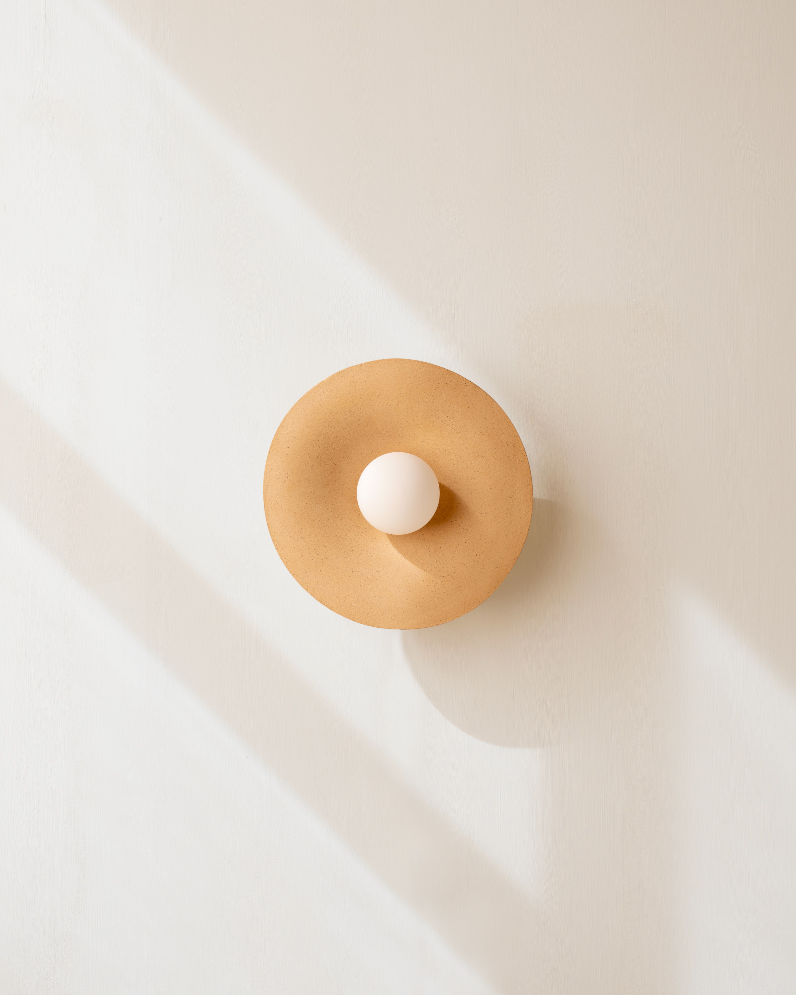 A sublimely minimal surface mount whose handmade ceramic shade steals the show. Made by manually draping clay slabs over press molds, each shade pairs a uniform shape with a textured surface that’s innately one-of-a-kind. Its glowing centerpiece: a spherical, hand-blown glass diffuser, affixed to its core like a pearl in an oyster.