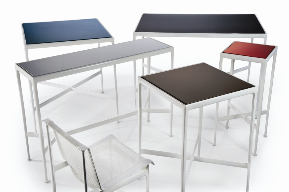 - Tabletops in glass, porcelain enamel on steel and vertical grain teak.
