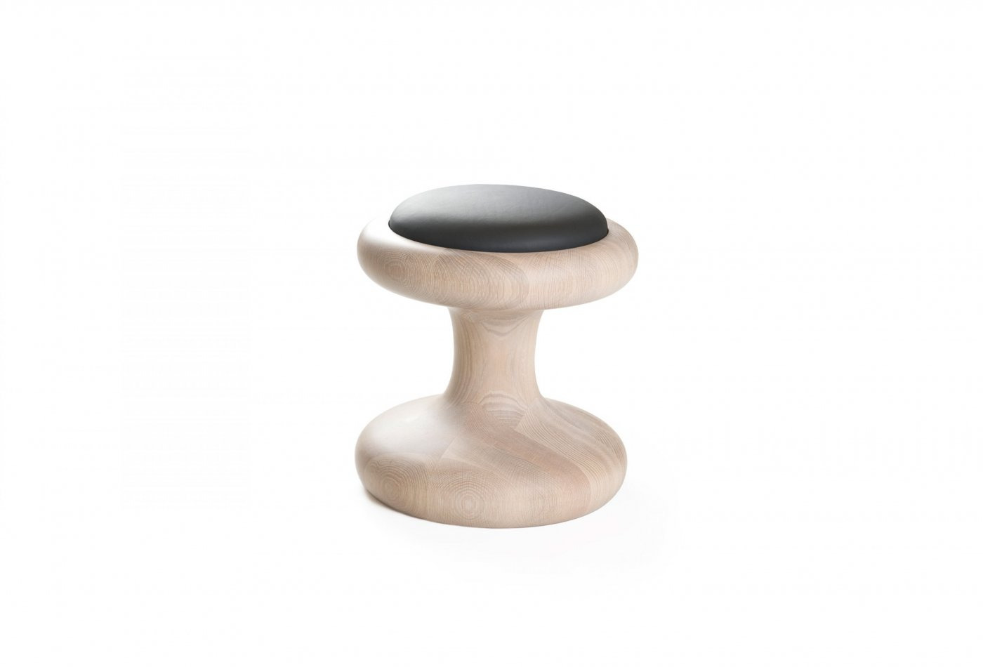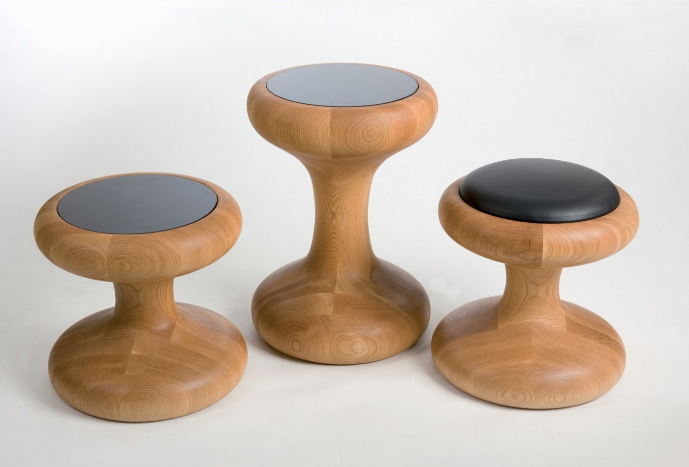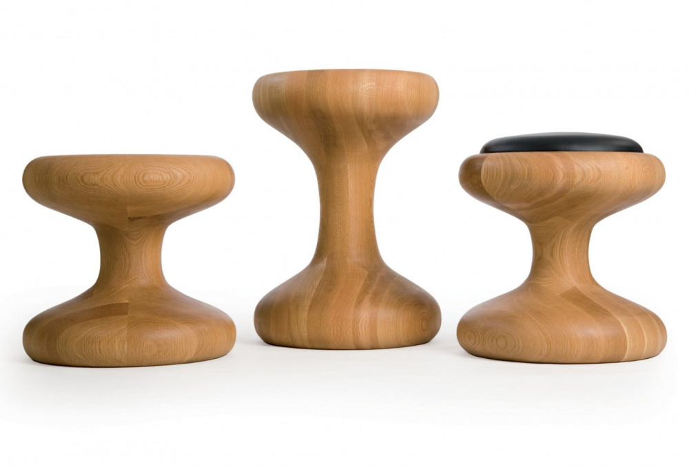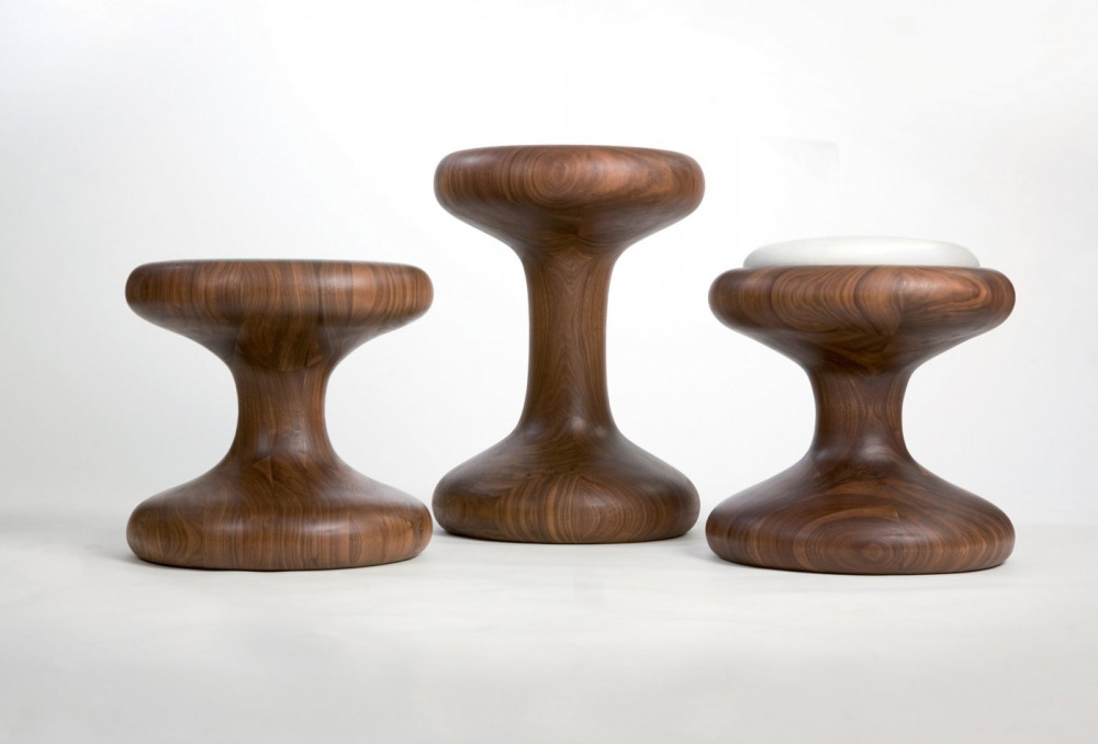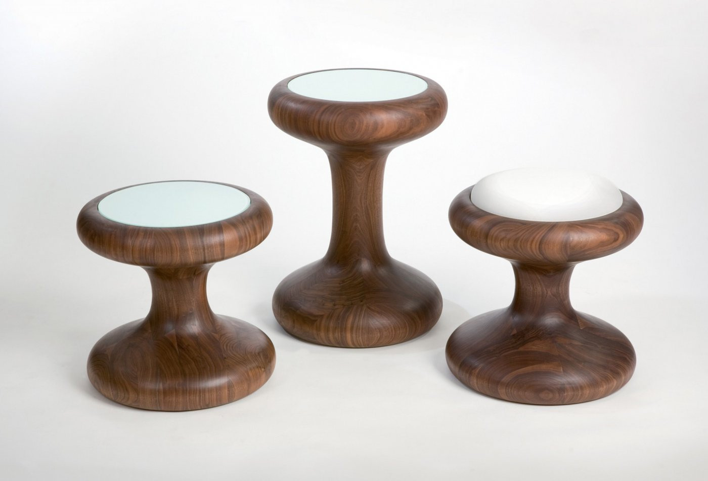 Mushroom Family is comprised of two tables and a stool, with impressive curves that flaunt the rich luxury of solid wood. The stool has an upholstered seat cushion for comfortable seating, while the coffee tables support black or white painted glass.