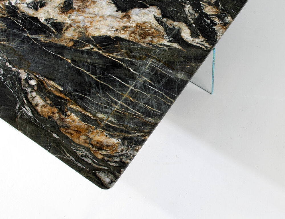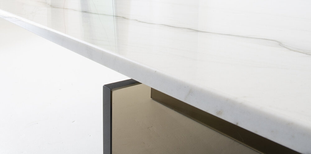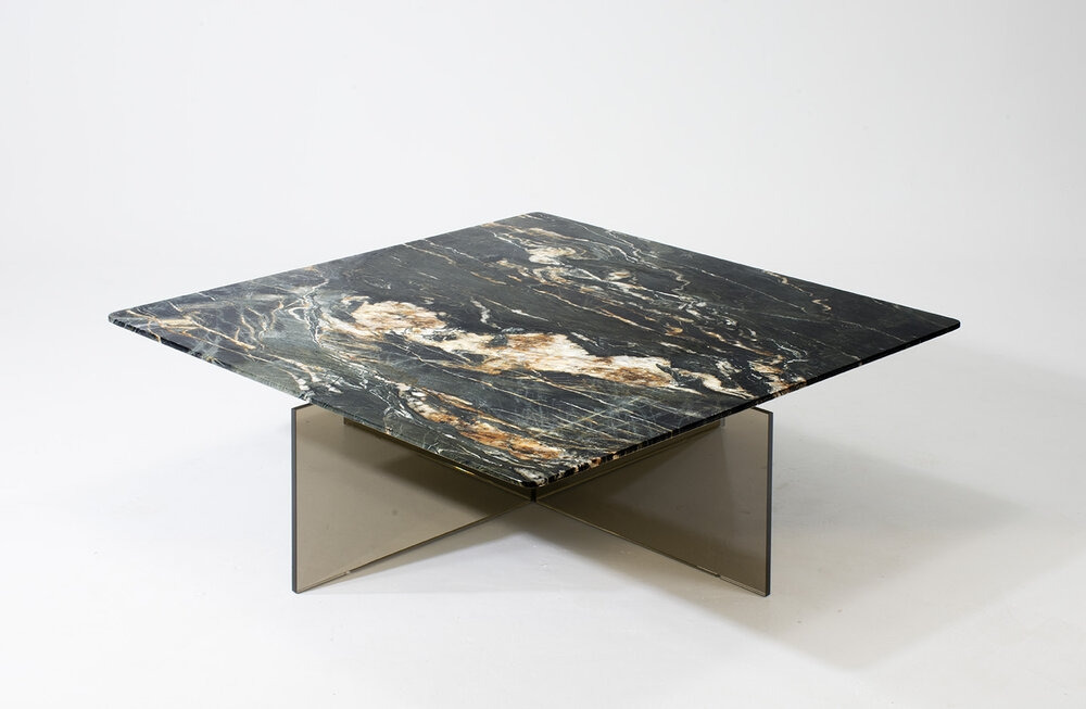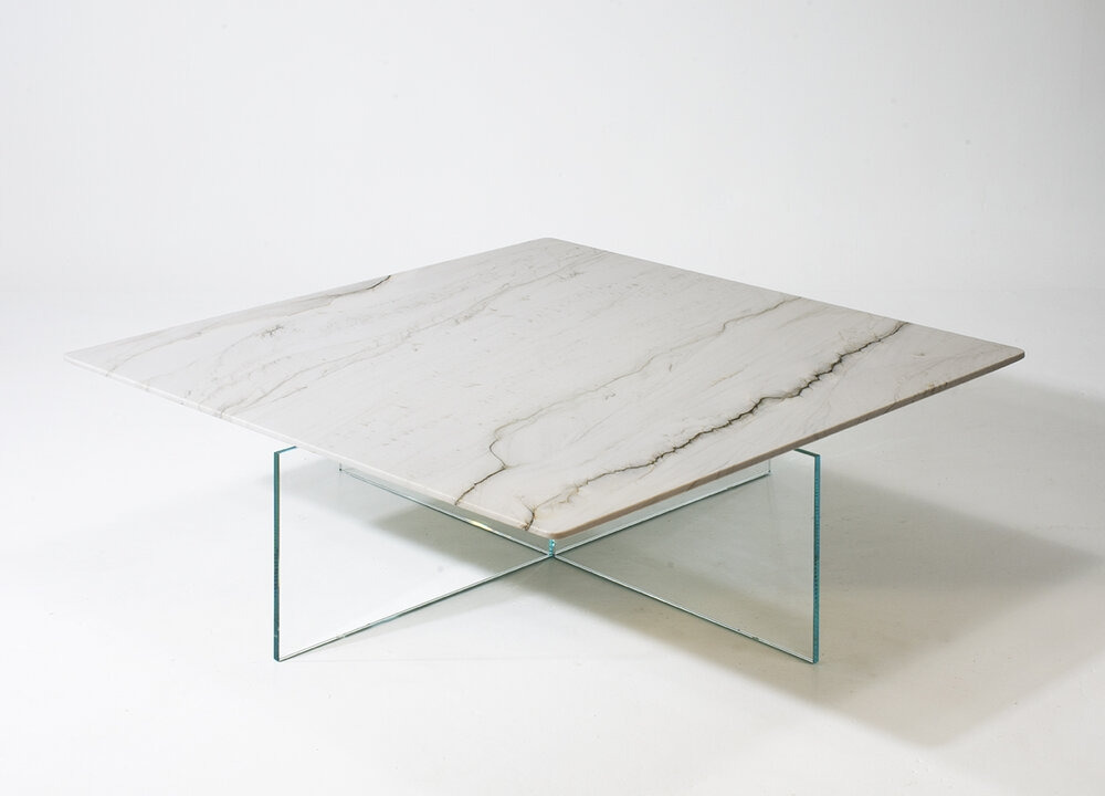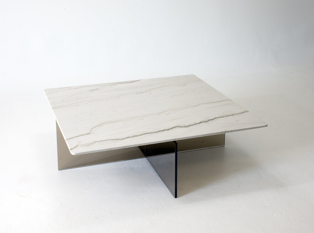 A slab of marble appearing to float above a base of ultra-clear or bronzed glass. By hand shaping the underside of the marble slab this floating effect is a simple gesture that elevates the design in a subtle yet compelling manner. Available in either square or round and in two different heights the table can be placed alone or in combination with the “Remember Me” table.