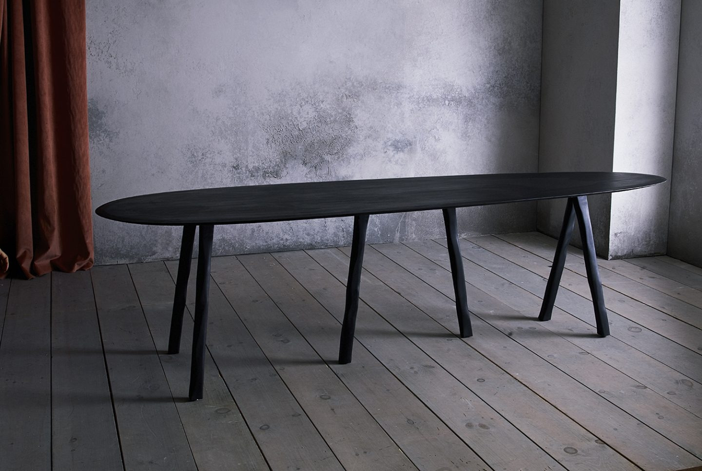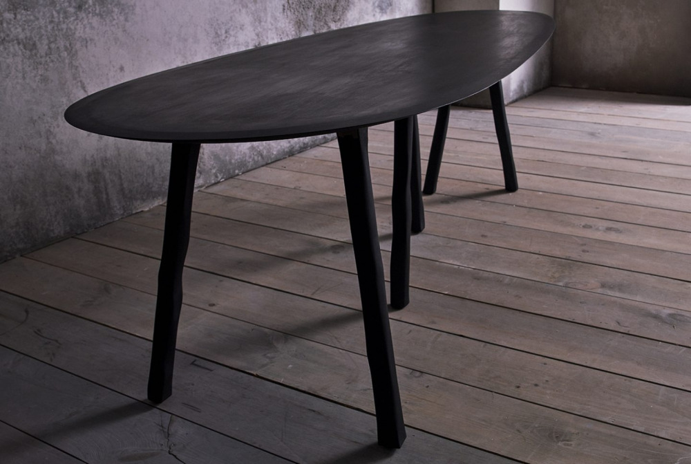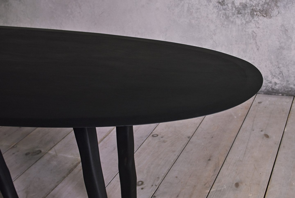 This W Table is made from hard maple wood. Each leg is meticulously hand carved making each work a one off. The oval shape, with a smaller radius at one end than the other, is designed to make it the perfect table for conversation. This unique shape allows each guest to see everyone else at the table, encouraging long dinners and space to sit for hours with friends.