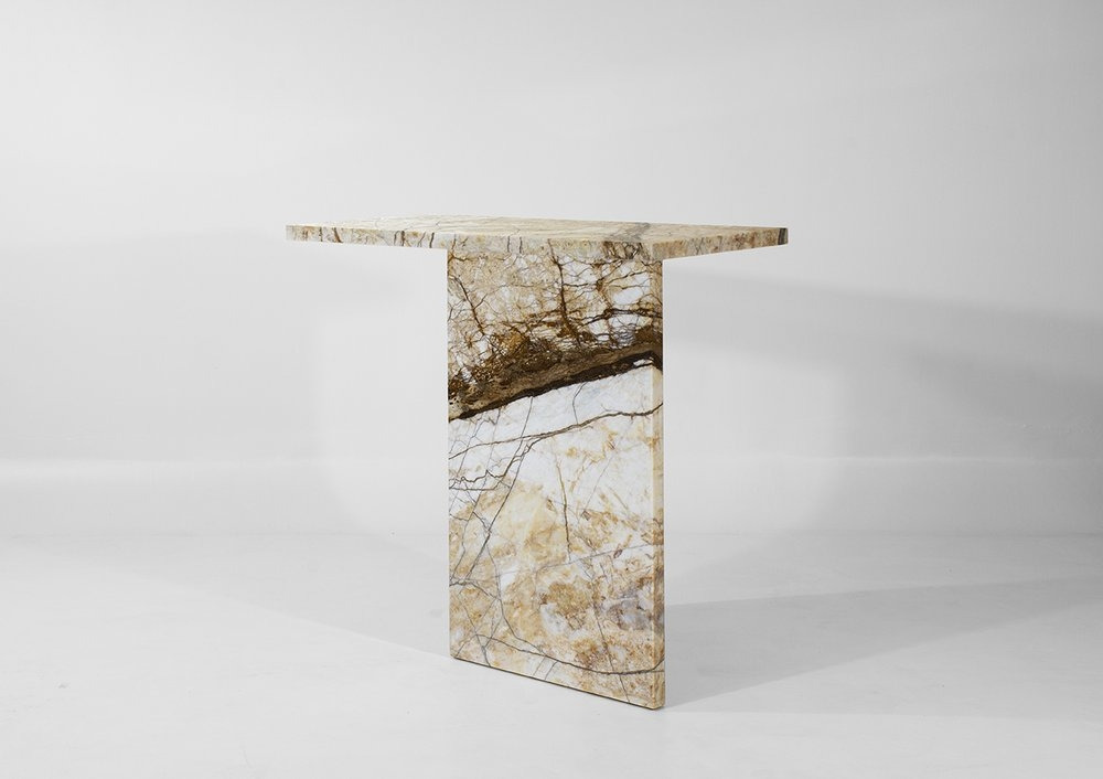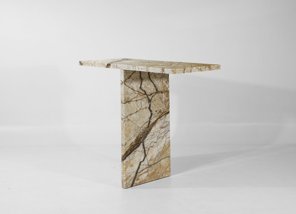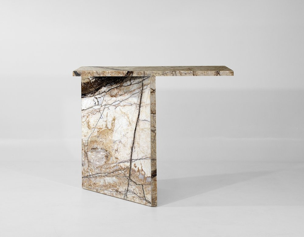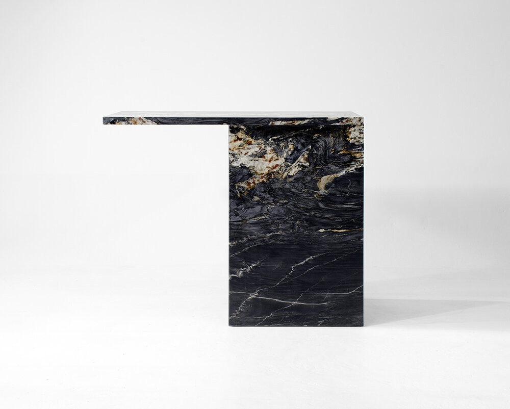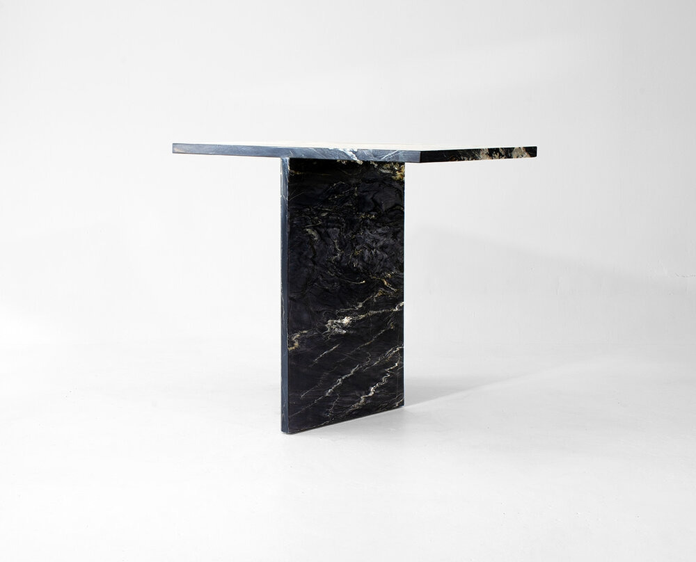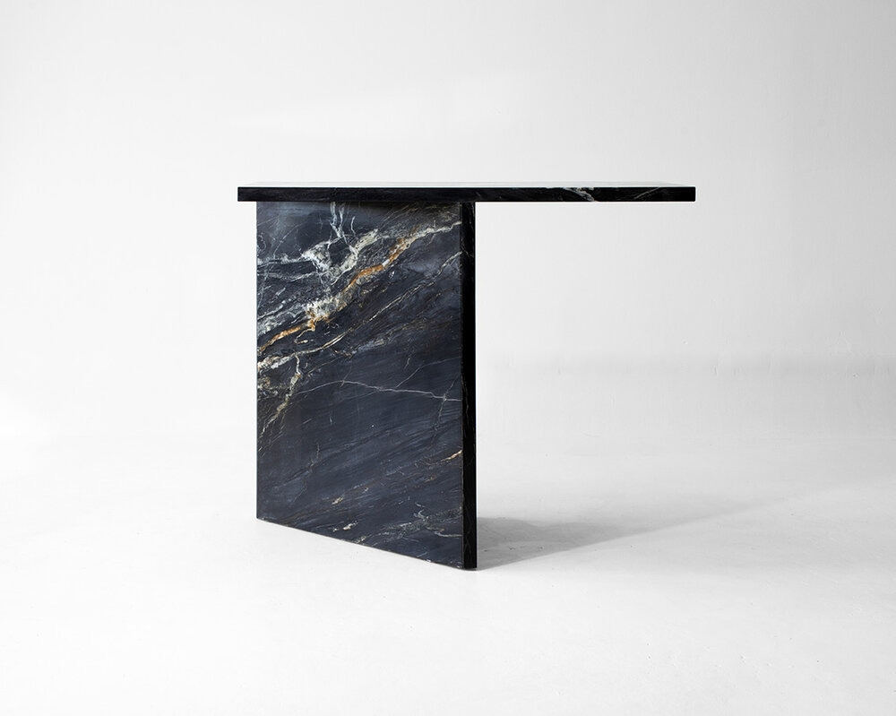 A console which has four distinct elevations. The strength and weight of the piece creates a sense of stability while simultaneously appearing as if it may fall over at any minute. The asymmetrical, triangular base in combination with the cantilevered top creates a piece that is both simple and complex, fragile and permanent depending on which elevation is displayed.